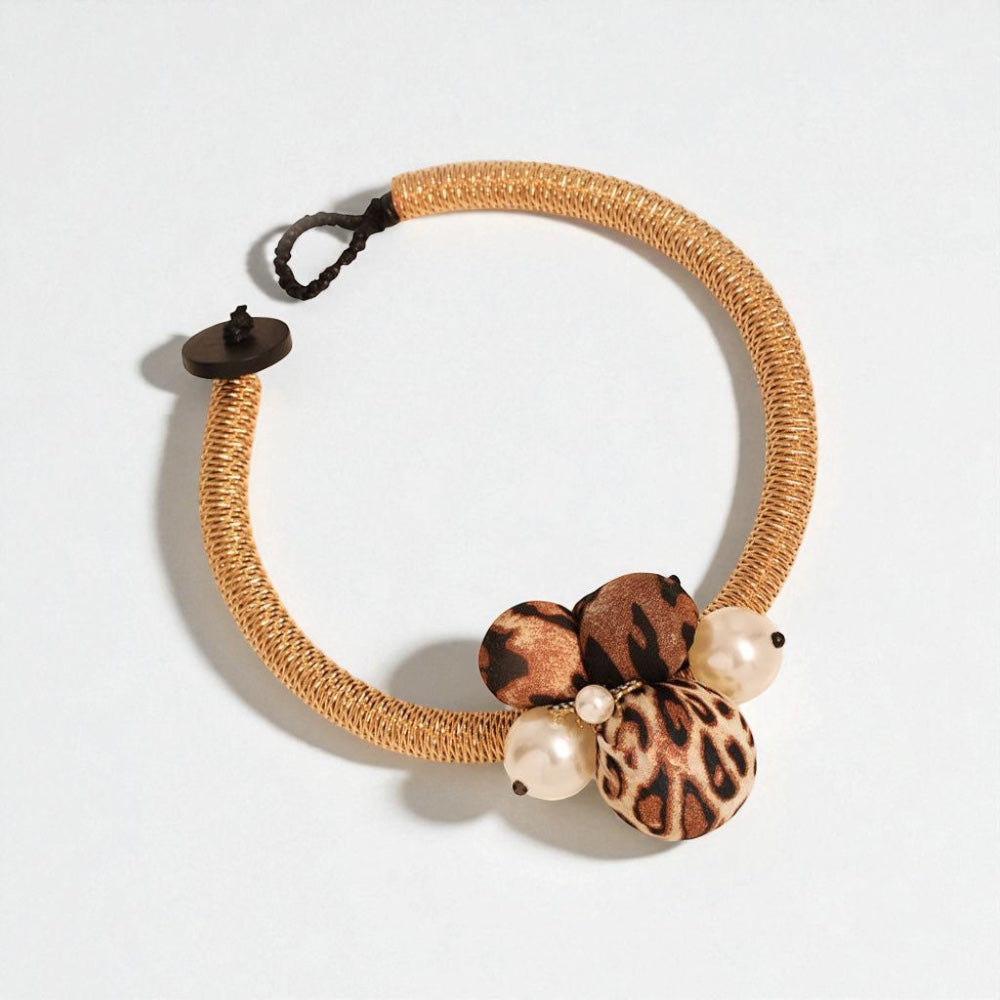 Make a lasting impression with our Leopard Pearl Statement Necklace, designed to bring bold, artistic flair to any outfit. This unique necklace features a cluster of decorative elements, including leopard print fabric-covered balls and white imitation pearls on a thick gold colored necklace. This is the perfect accessory to add statement to everyday and occasion wear. Its lightweight yet striking design makes it a must-have for fashion boutiques, jewelry shops, and wholesale buyers seeking unique standout pieces.
